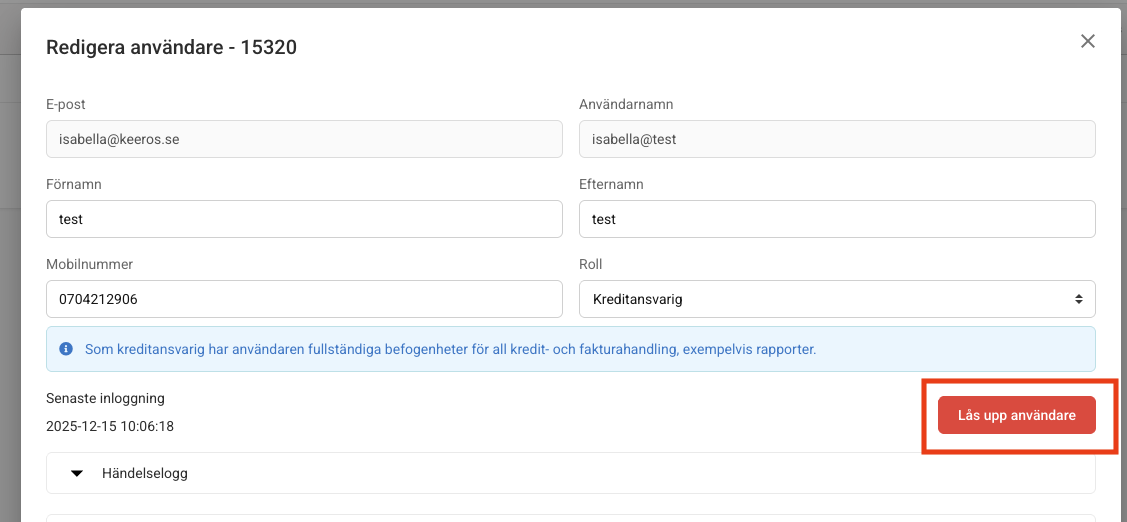 Klicka på en rad i listan över användarkonton för att ändra uppgifterna. Samma ruta som för Skapa användare visas, där det går att ändra allt utom e-postadressen och användarnamnet.