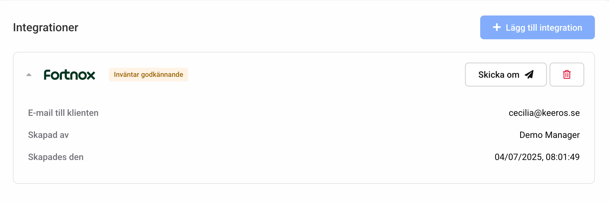 Nu är allt klart från er sida. Den kontaktperson du angav ovan får nu ett e-postmeddelande med en länk som tar dem till Fortnox för att godkänna att integrationen aktiveras. Det går nu att se vem som har skickat ut inbjudan, när och till vilken epostadress. Möjligheten att skicka om inbjudan samt ta bort integrationen helt finns också. Samma formulär som ovan visas vid Skicka om, med möjlighet att ändra e-postadressen.