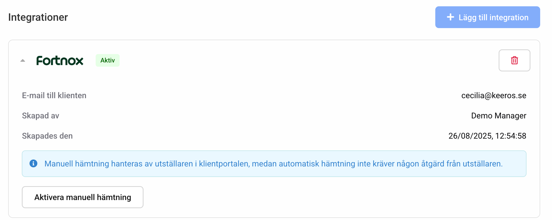 Manuell hämtning aktiveras genom knappen "Aktivera manuell hämtning". Aktivering påverkar inte originalfakturorna i Fortnox så länge ingen action utförs på dem i kundwebben. Det går att när som helst aktivera automatisk hämtning igen, alla fakturor som inte är hämtade kommer då in i Keeros.
