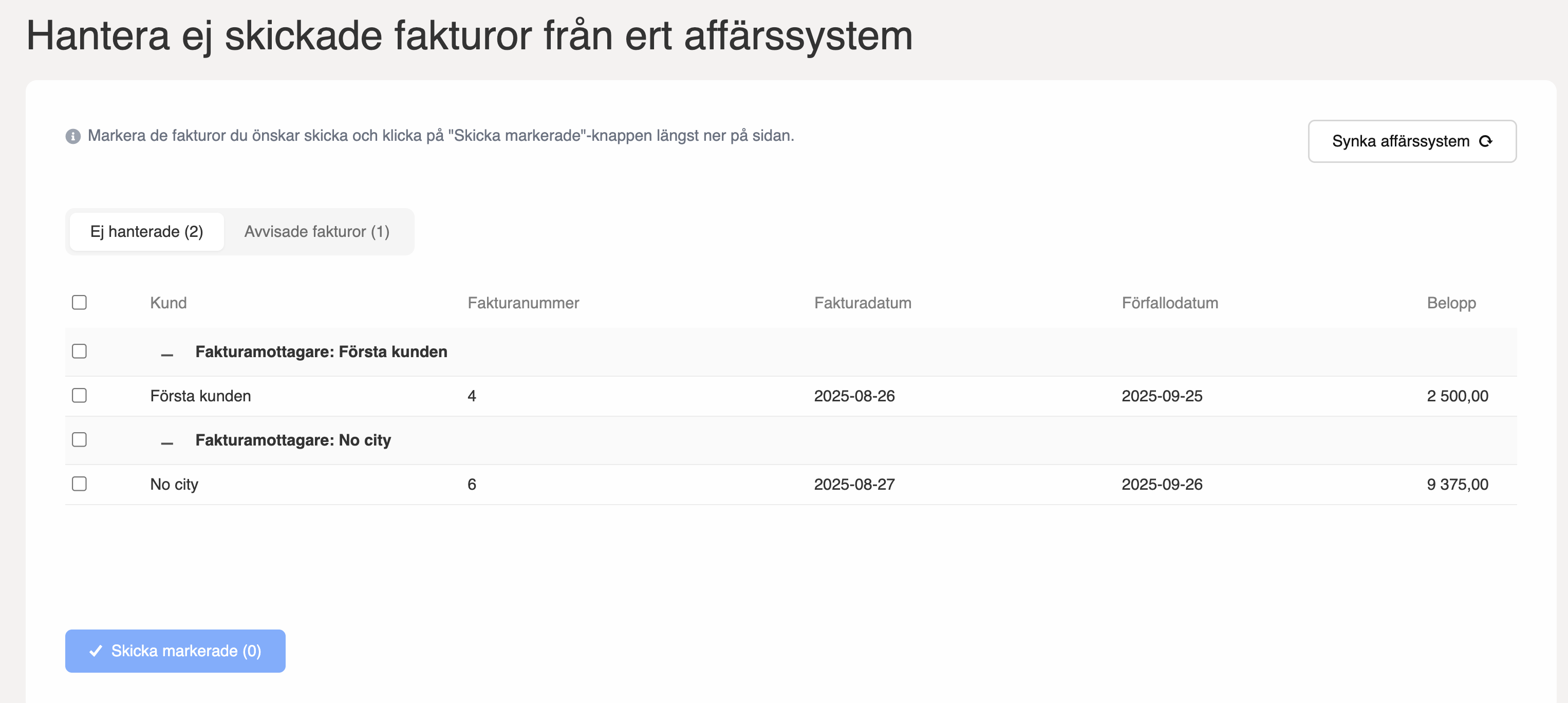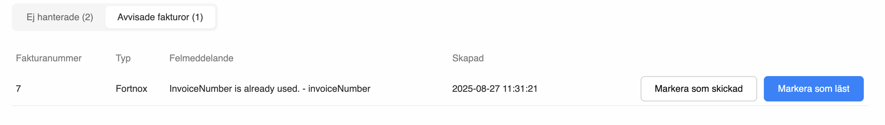 Om en faktura inte kan skickas in visas den under "Avvisade fakturor" samt orsak.