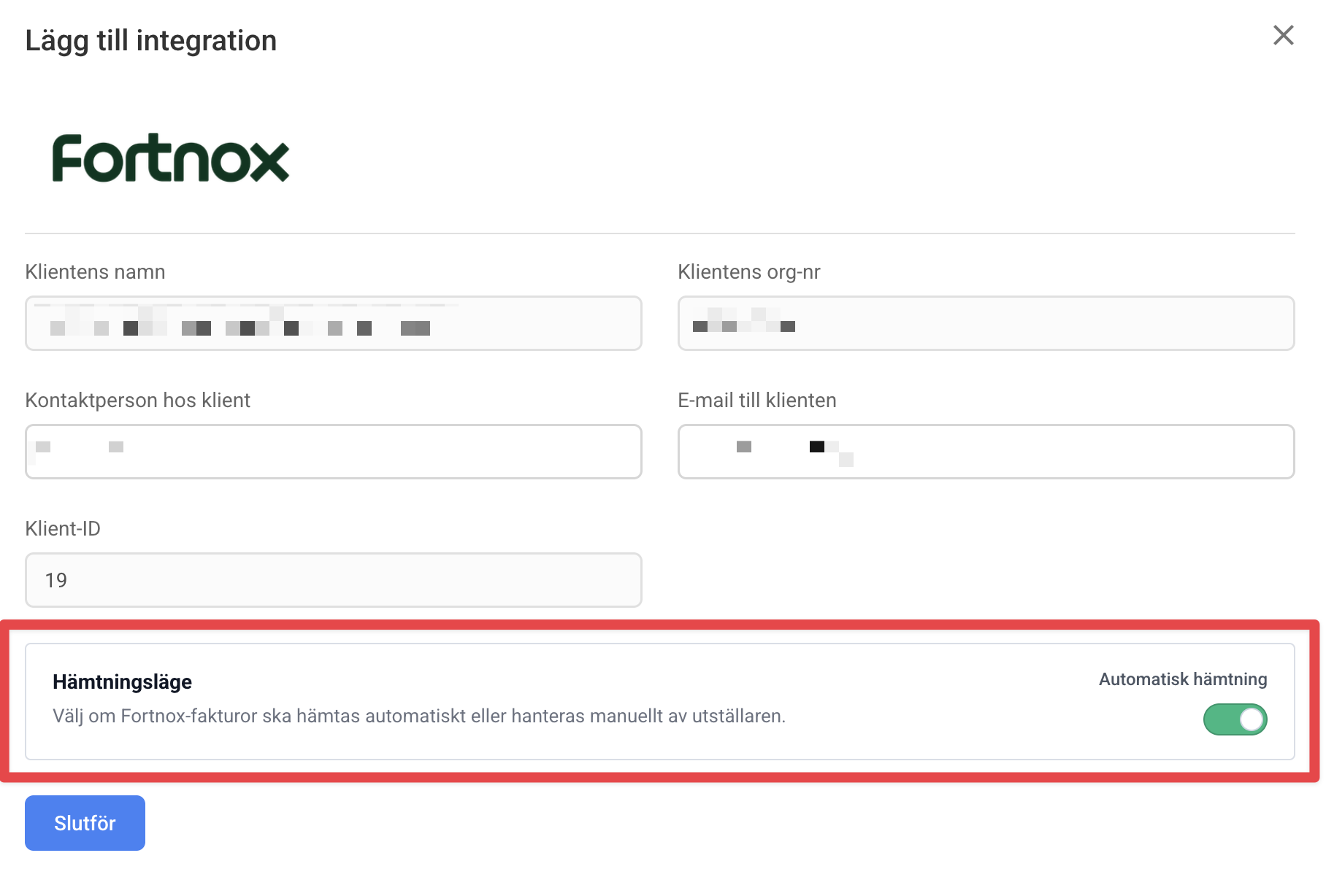 Kunden får som sagt ett mail där de måste ge sitt medgivande till att ni får åtkomst att hämta fakturor i deras Fortnox.