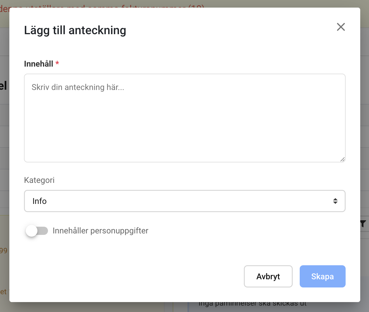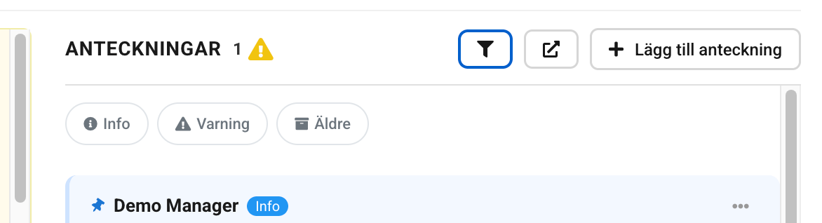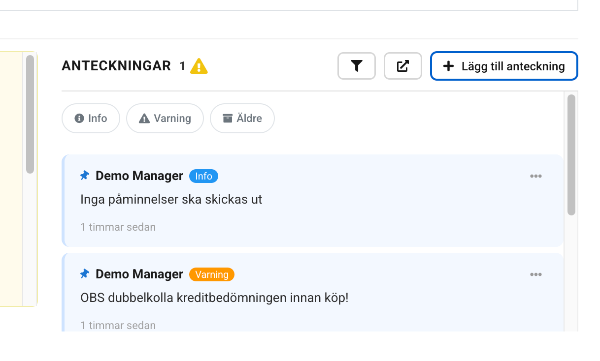 Klicka på "Lägg till anteckning", eller Åtgärder -> Lägg till anteckning där vid begränsat utrymme. Skriv din anteckning och välj kategori Info eller Varning. Klicka i "Innehåller personuppgifter" om sådant finns, det används vid rensning enligt GDPR vid behov. Klicka på Spara.