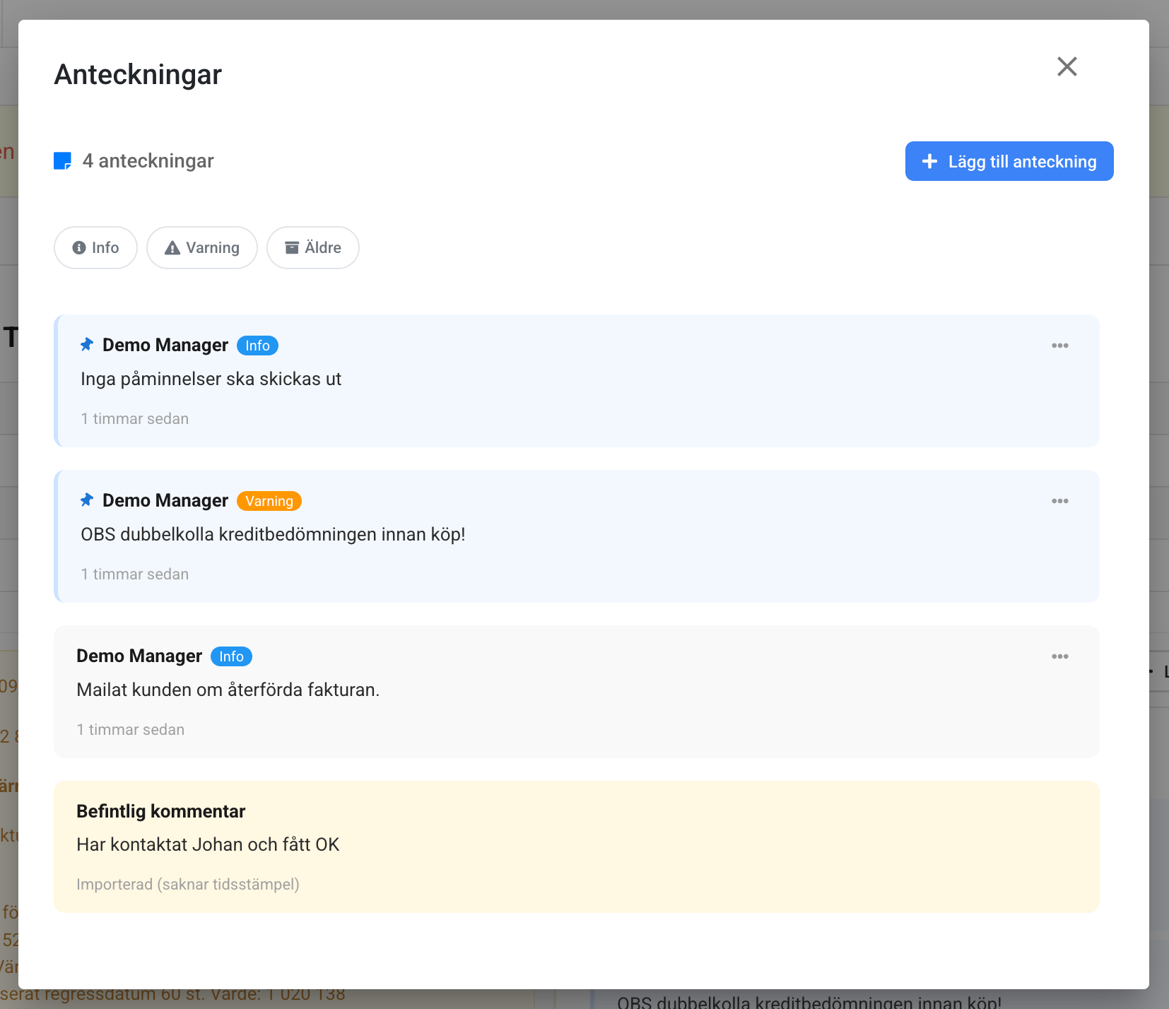 Anteckningar är notiser som handläggare kan lägga till på både fakturautställare och fakturamottagare, för att förmedla information och varningar där de behövs.