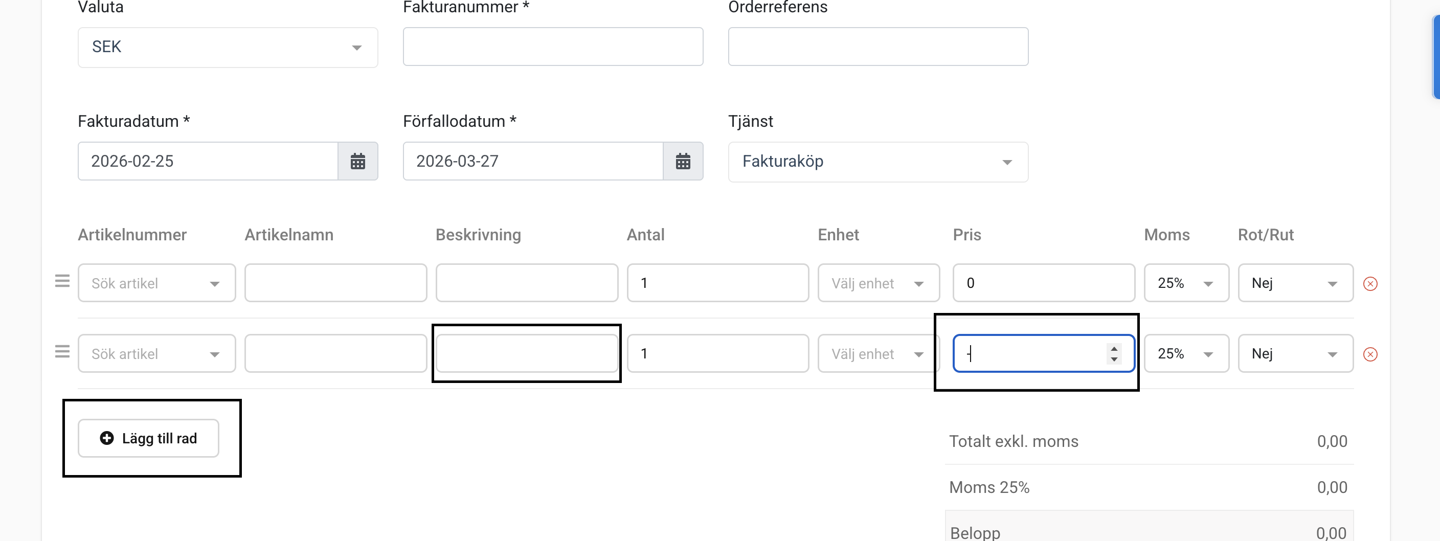 Genom att använda fakturarader för dessa justeringar säkerställer du att både momsberäkningen och slutsumman som skickas till kunden blir rätt.