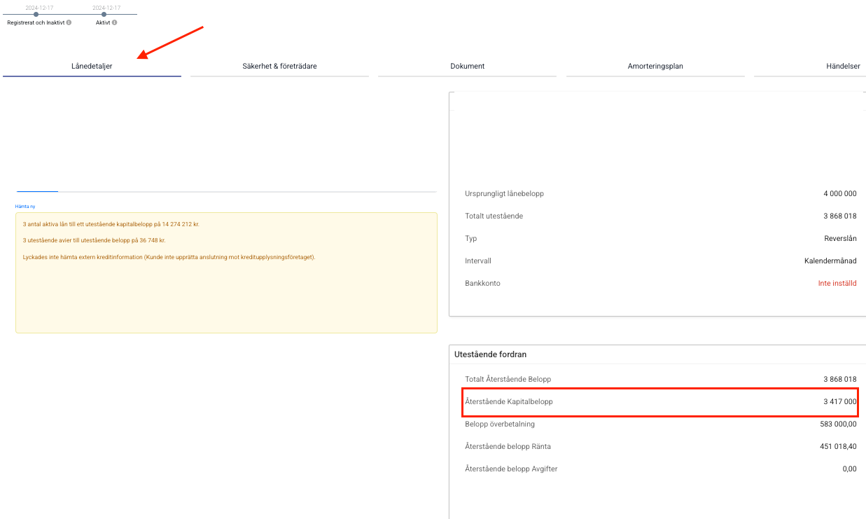 Du kan se det under lånedetaljer - Kvarståendebelopp.