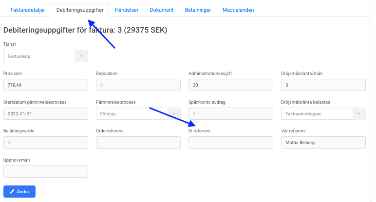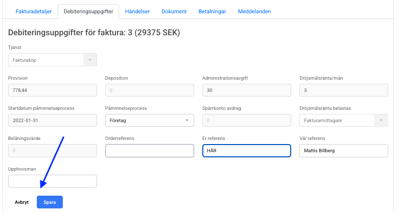 När referensen är sparad i systemet kan du skicka om fakturan. Nu kommer API:et att fånga upp informationen och skicka med den i e-fakturan, vilket gör att mottagarens system kan ta emot den.