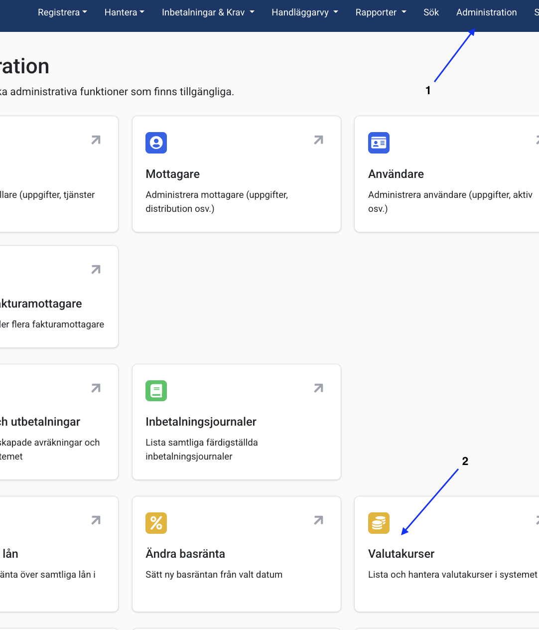 Navigera till administration: Börja med att gå till huvudmenyn och välj Administration. Klicka därefter på alternativet Valutakurser.