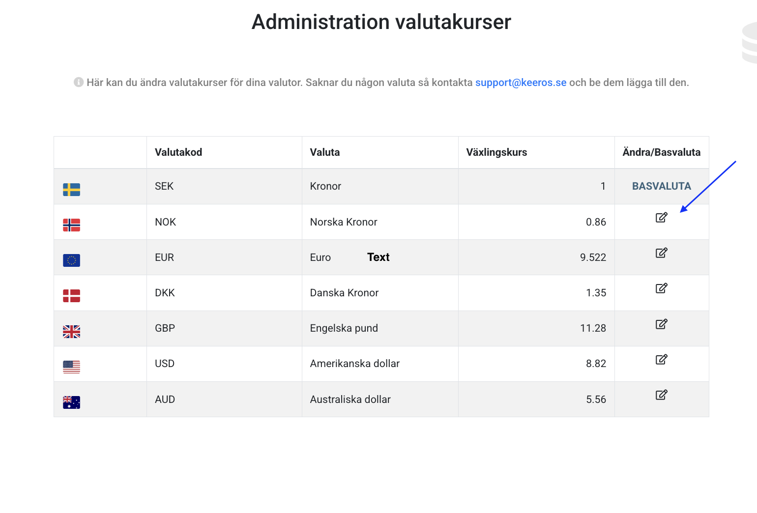 Välj valuta att justera: Du kommer nu till en översiktssida där alla tillgängliga valutor visas i egna boxar. Hitta den valuta du vill ändra och klicka på pennan i boxen för att öppna redigeringsläget.